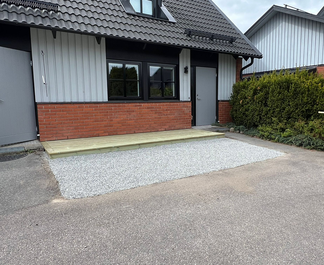 Totalrenovering av en entre där buskar schaktades bort och markduk, grus och liten altan tog ny plats.