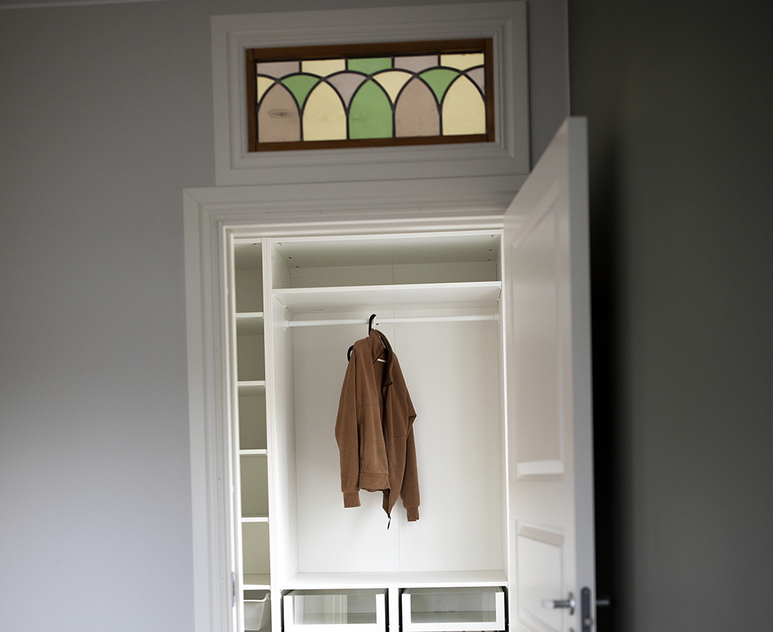 En stor rymlig garderob med fina detaljer som vi byggt i ett av våra nyproduktioner.